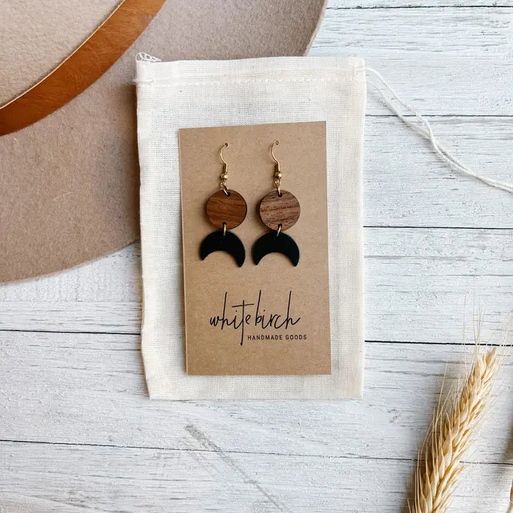Leather Moon & Walnut Wood Circle Dangle Earrings